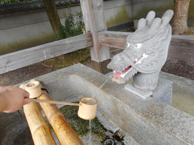 左手を清める 龍神の前に立ち、右手で柄杓(ひしゃく)を持ち龍神の口から流れる水を汲み左手に水をかけて洗い流す。 |